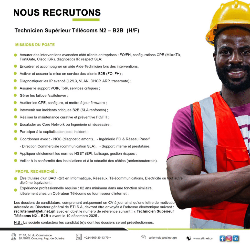 recrutement@eti.net.gn avec en objet le numéro de référence suivant: <<< Technicien Supérieur