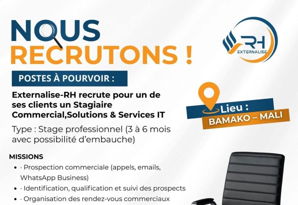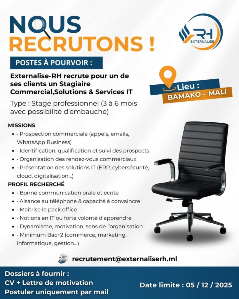 Nous recherchons un Stagiaire Commercial, Solutions & Services IT pour l’un de nos clients basé à Bamako.