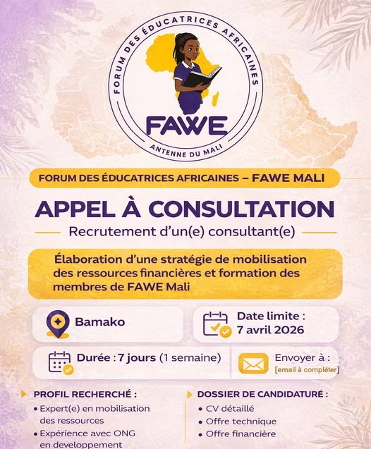 Le Forum for African Women Educationalists (FAWE), à travers son chapitre national FAWE-Mali, œuvre pour la promotion de l’éducation des filles et l’égalité de genre au Mali. Dans un contexte de raréfaction des financements et de diversification des priorités des bailleurs, FAWE-Mali souhaite renforcer ses capacités institutionnelles en matière de mobilisation des ressources.