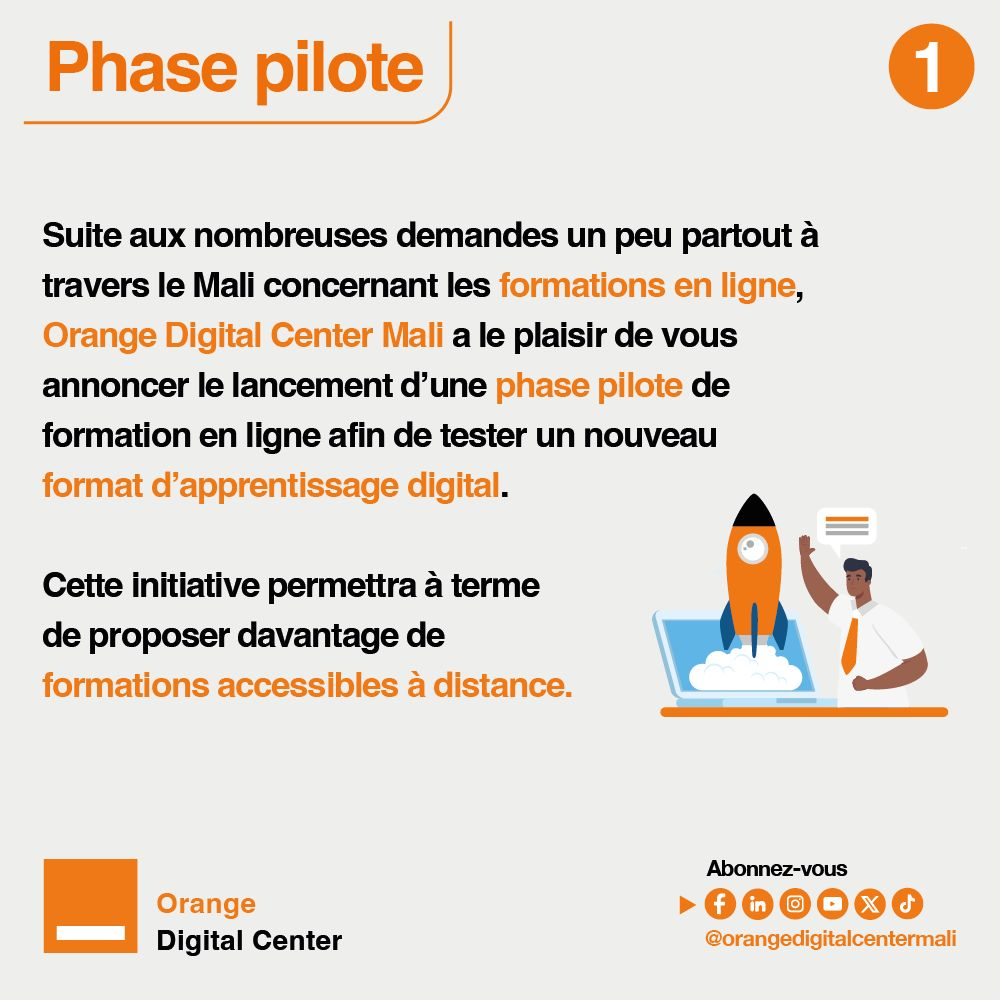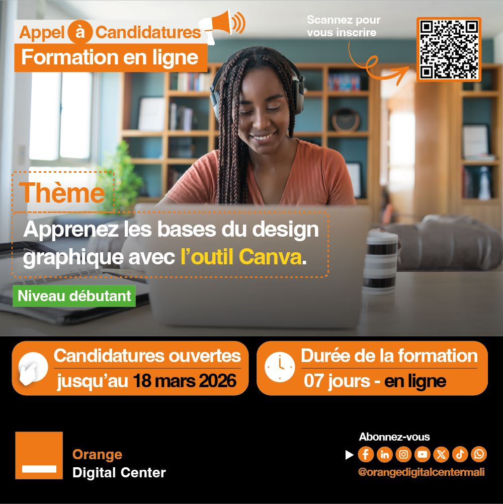 Orange Digital Center Mali lance une phase pilote de formation en ligne afin de tester un nouveau format d’apprentissage digital. Pour cette première session, apprenez les bases du design graphique avec l’outil Canva à travers un module complet, des vidéos explicatives et des exercices pratiques.