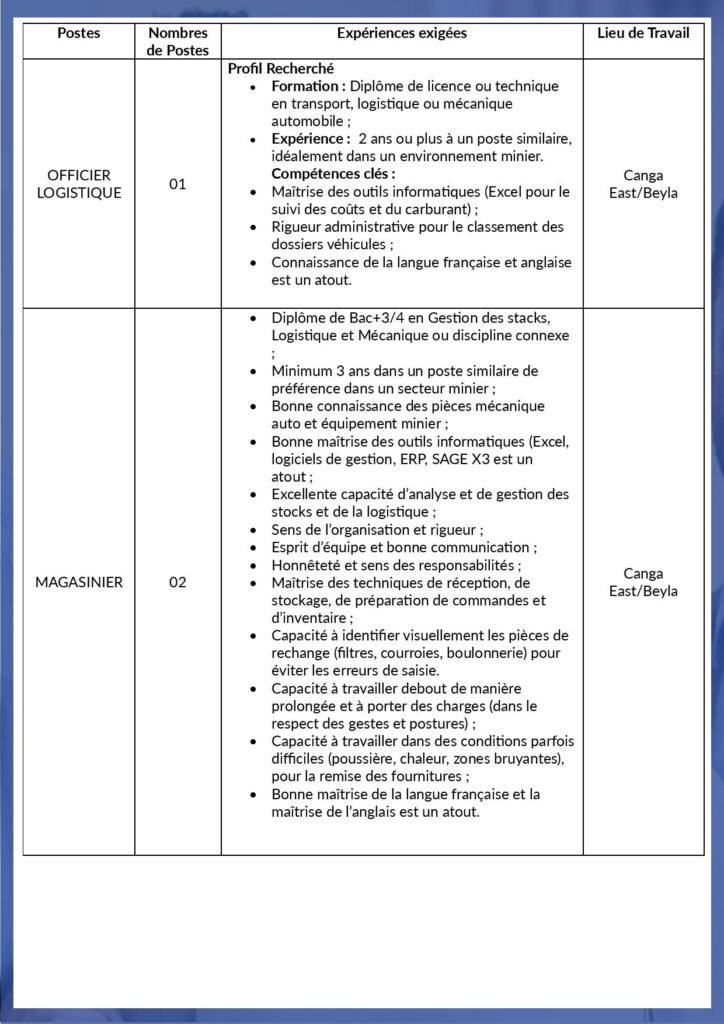 | MAGASINIER | 02 | • DiplĂ´me de Bac+3/4 en Gestion des stacks, Logistique et MĂ©canique ou discipline connexe; • Minimum 3 ans dans un poste similaire de prĂ©fĂ©rence dans un secteur minier; • Bonne connaissance des pièces mĂ©canique auto et Ă©quipement minier; • Bonne maĂ®trise des outils informatiques (Excel, logiciels de gestion, ERP, SAGE X3 est un atout; • Excellente capacitĂ© d’analyse et de gestion des stocks et de la logistique; • Sens de l’organisation et rigueur; • Esprit d’Ă©quipe et bonne communication; • HonnĂŞtetĂ© et sens des responsabilitĂ©s; • MaĂ®trise des techniques de rĂ©ception, de stockage, de prĂ©paration de commandes et d’inventaire; • CapacitĂ© Ă identifier visuellement les pièces de rechange (filtres, courroies, boulonnerie) pour Ă©viter les erreurs de saisie. • CapacitĂ© Ă travailler debout de manière prolongĂ©e et Ă porter des charges (dans le respect des gestes et postures); • CapacitĂ© Ă travailler dans des conditions parfois difficiles (poussière, chaleur, zones bruyantes), pour la remise des fournitures; • Bonne maĂ®trise de la langue française et la maĂ®trise de l’anglais est un atout. | Canga East/Beyla |