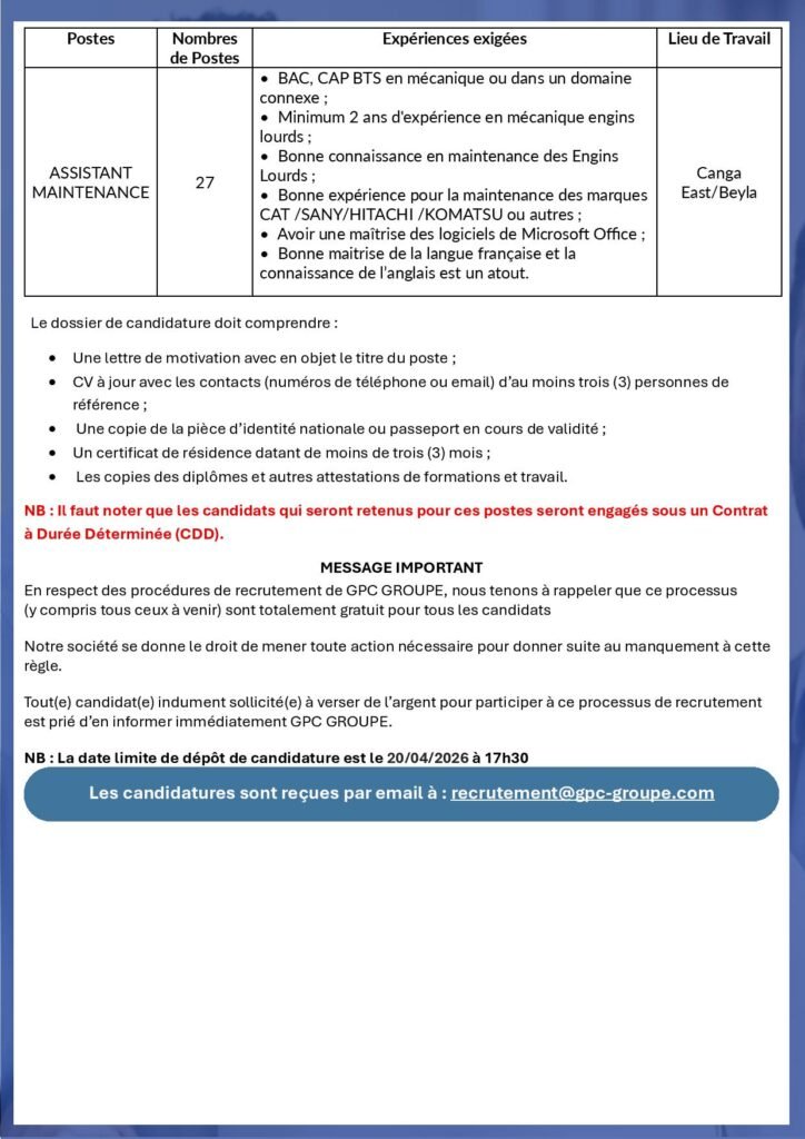 Les candidatures sont reçues par email à : recrutement@gpc-groupe.com