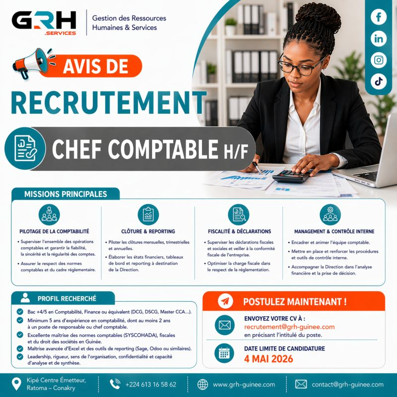 Nous recherchons un Chef Comptable expérimenté pour rejoindre notre équipe dans le secteur du commerce à Conakry. Ce poste stratégique consiste à superviser l’ensemble des opérations comptables et financières de l’entreprise, en garantissant la conformité aux normes comptables locales et internationales. Le Chef Comptable sera responsable de la production des états financiers, du pilotage de l’équipe comptable et de l’optimisation des processus financiers. Il jouera un rôle clé dans la prise de décision stratégique en fournissant des analyses financières pertinentes à la direction. Ce poste offre une excellente opportunité d’évolution dans un environnement commercial dynamique et en pleine croissance.