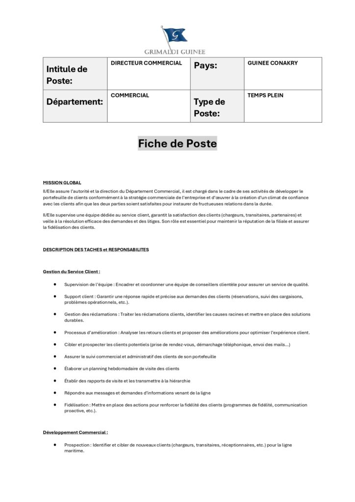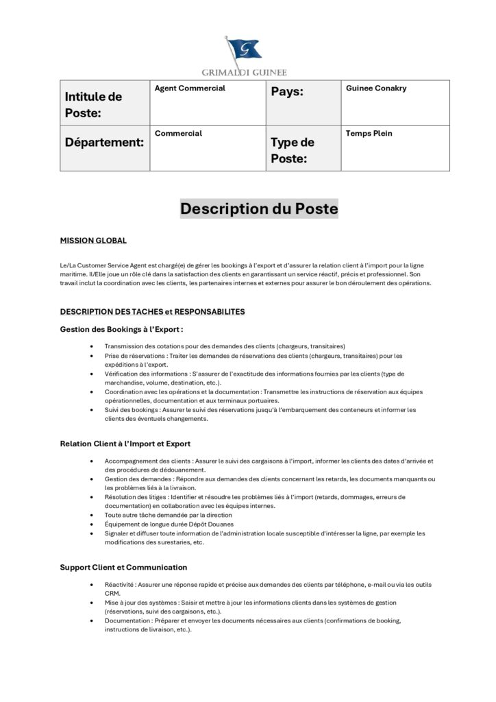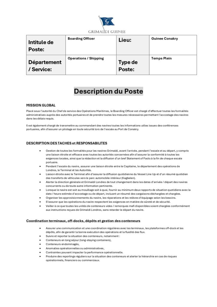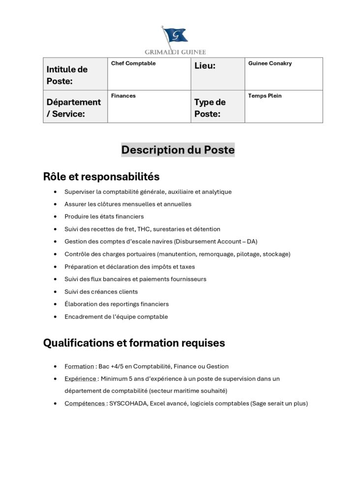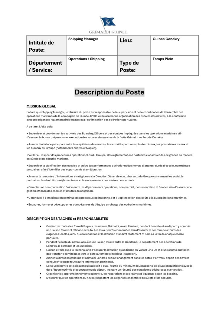 Les candidats intéressés sont invités à envoyer leur CV accompagné d’une lettre de motivation à l’adresse suivante : recruitement@grimaldiguinee.com.