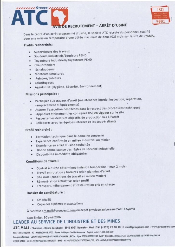 Dans le cadre d’un arrêt programmé d’usine, la société Groupe ATC recrute du personnel qualifié pour une mission temporaire d’une durée maximale de deux (02) mois sur le site de Syama.