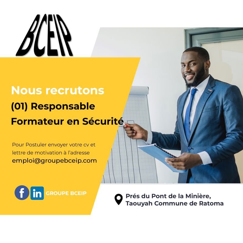 Pour postuler : Les dossiers de candidature (CV et lettre de motivation) sont déposés aux bureaux de BCEIP de Kamsar (En Face de la Direction des Chemins de Fer CBG……) et de Sangarédi (derrière l’Eglise Catholique de la Cité Quartier DELFROD (628-240-836/669-526-277/621-422-415/), ou envoyez vos cv et lettres de motivation par courriel à l’adresse suivante : emploi@groupebceip.com