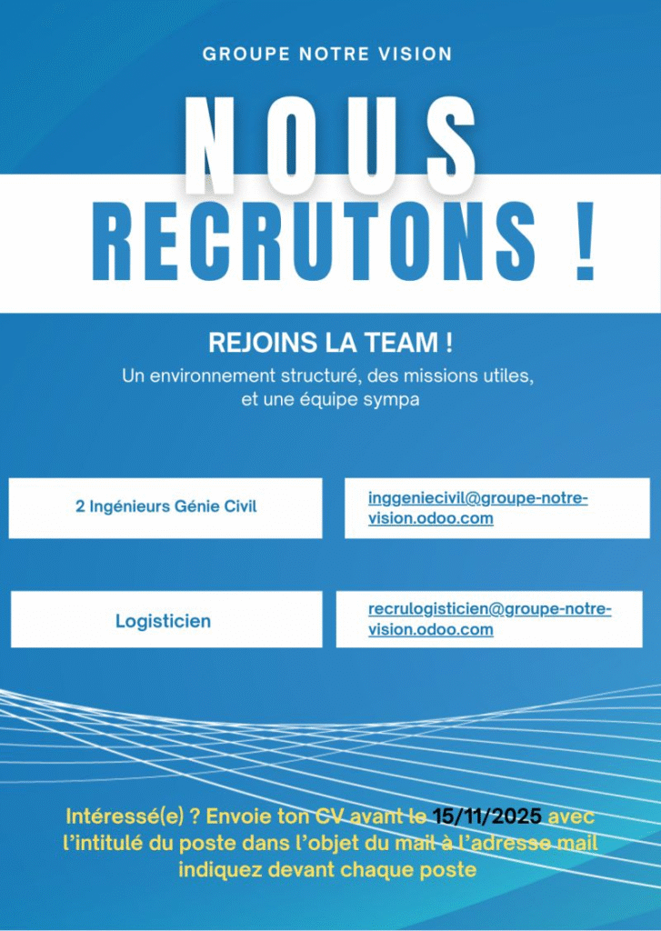 Candidatures à envoyer à : inggeniecivil@groupe-notre-vision.odoo.com