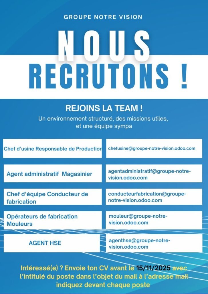 Dans le cadre de la mise en place de sa nouvelle usine de production de poteaux électriques en béton, Groupe Notre Vision lance un appel à candidatures pour le recrutement du personnel technique et administratif suivant :