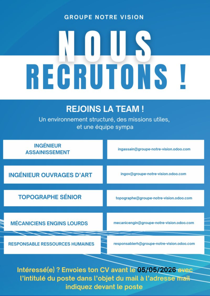 Pour le lancement d’un projet routier Ă  Conakry, Groupe Notre Vision (GNV) recrute plusieurs profil dont :