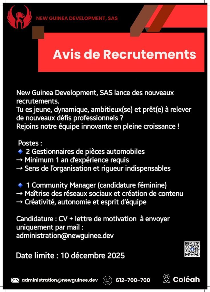 Candidature (CV + lettre de motivation) uniquement par mail : administration@newguinee.dev