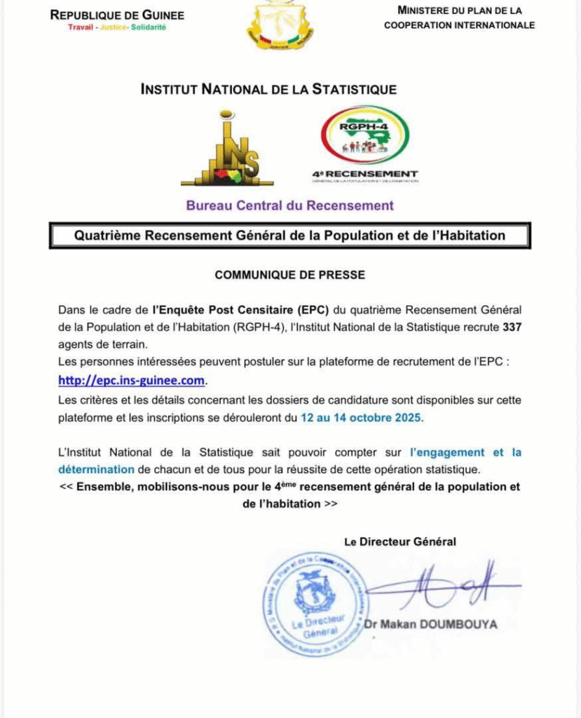 de la Population et de l’Habitation (RGPH-4), I’Institut National de la Statistique recrute 337
