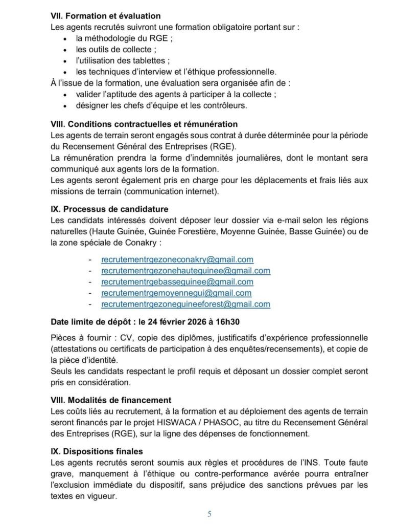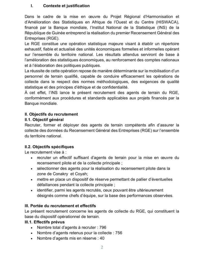 À cet effet, l’INS lance le présent recrutement des agents de terrain du RGE, conformément aux procédures et standards applicables aux projets financés par la Banque mondiale.