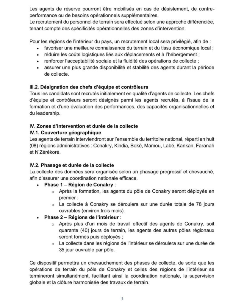 Ce dispositif permettra un chevauchement des phases de collecte, de sorte que les opérations de terrain du pôle de Conakry et celles des régions de l’intérieur se termineront simultanément, facilitant ainsi la coordination nationale, la supervision globale et la clôture harmonisée des travaux de terrain.