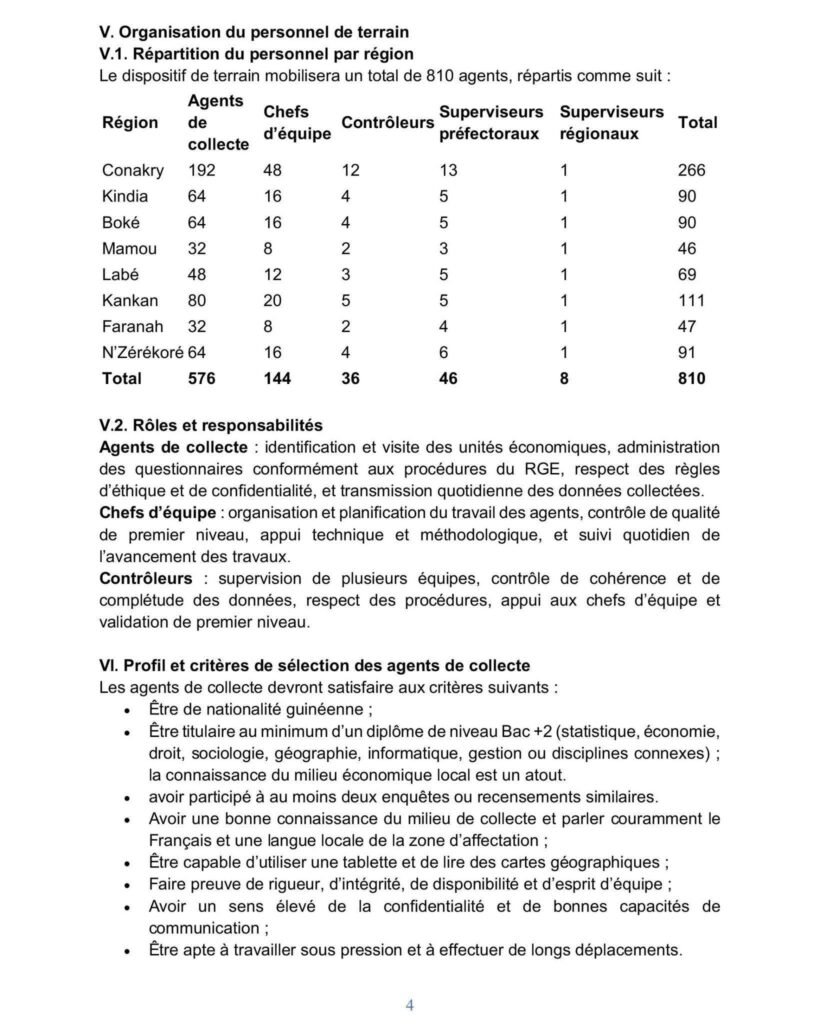 Tous les candidats sont recrutés initialement en qualité d’agents de collecte. Les chefs d’équipe et contrôleurs seront désignés parmi les agents recrutés, à l’issue de la formation et d’une évaluation des performances, des capacités organisationnelles et du leadership.