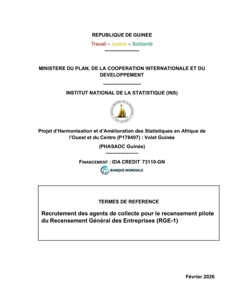 Dans le cadre de la mise en œuvre du Projet Régional d’Harmonisation et d’Amélioration des Statistiques en Afrique de l’Ouest et du Centre (HISWACA), financé par la Banque mondiale, l’Institut National de la Statistique (INS) de la République de Guinée entreprend la réalisation du premier Recensement Général des Entreprises (RGE).
