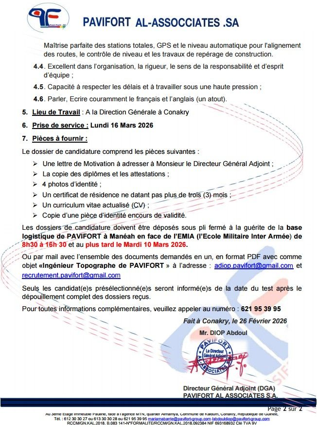 Les dossiers de candidature doivent ĂŞtre dĂ©posĂ©s sous pli fermĂ© Ă  la guĂ©rite de la base logistique de PAVIFORT Ă  ManĂ©ah en face de l’EMIA (l’Ecole Militaire Inter ArmĂ©e) de 8h30 Ă  16h 30 et au plus tard le Mardi 10 Mars 2026.