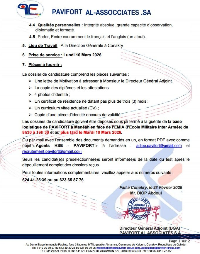 Ou par mail avec l’ensemble des documents demandĂ©s en un, en format PDF avec comme objet « Agents HSE PAVIFORT » Ă  l’adresse: adiop.pavifort@gmail.com et recrutement.pavifort@gmail.com