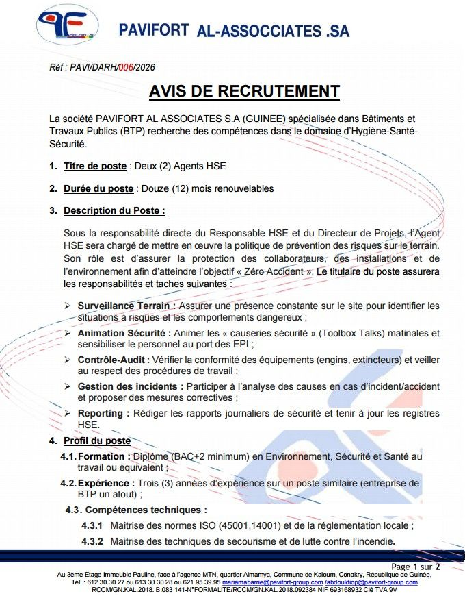 La sociĂ©tĂ© PAVIFORT AL ASSOCIATES S.A (GUINEE) spĂ©cialisĂ©e dans Bâtiments et Travaux Publics (BTP) recherche des compĂ©tences dans le domaine d’Hygiène-SantĂ©-SĂ©curitĂ©.