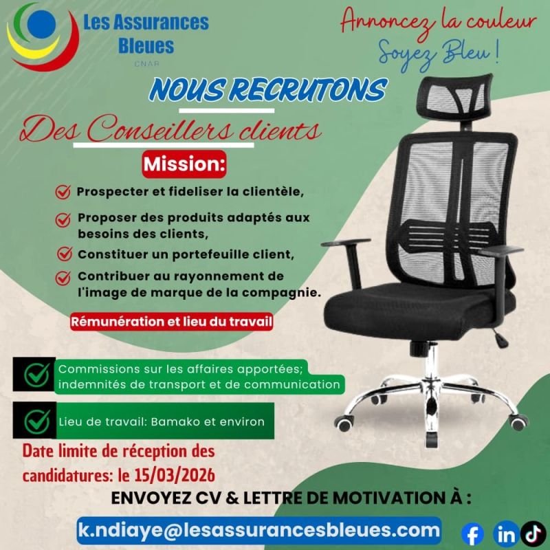 Nous recherchons des 𝑪𝙤𝒏𝙨𝒆𝙞𝒍𝙡𝒆𝙧𝒔 𝒄𝙡𝒊𝙚𝒏𝙩𝒔 passionnés pour renforcer notre présence à Bamako et dans ses environs .