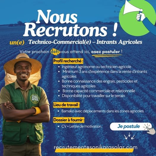 Dans le cadre du dรฉveloppement de ses activitรฉs, Mali Agro-Sewa recrute un Responsable Technico-Commercial spรฉcialisรฉ dans les intrants agricoles.