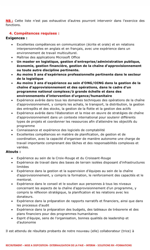 - Au moins 3 ans d’expérience au sein d’ONG/OING dans la gestion de la chaîne d’approvisionnement et des opérations, dans le cadre d’un programme national complexe/à grande échelle et dans des environnements d’intervention d’urgence/humanitaire