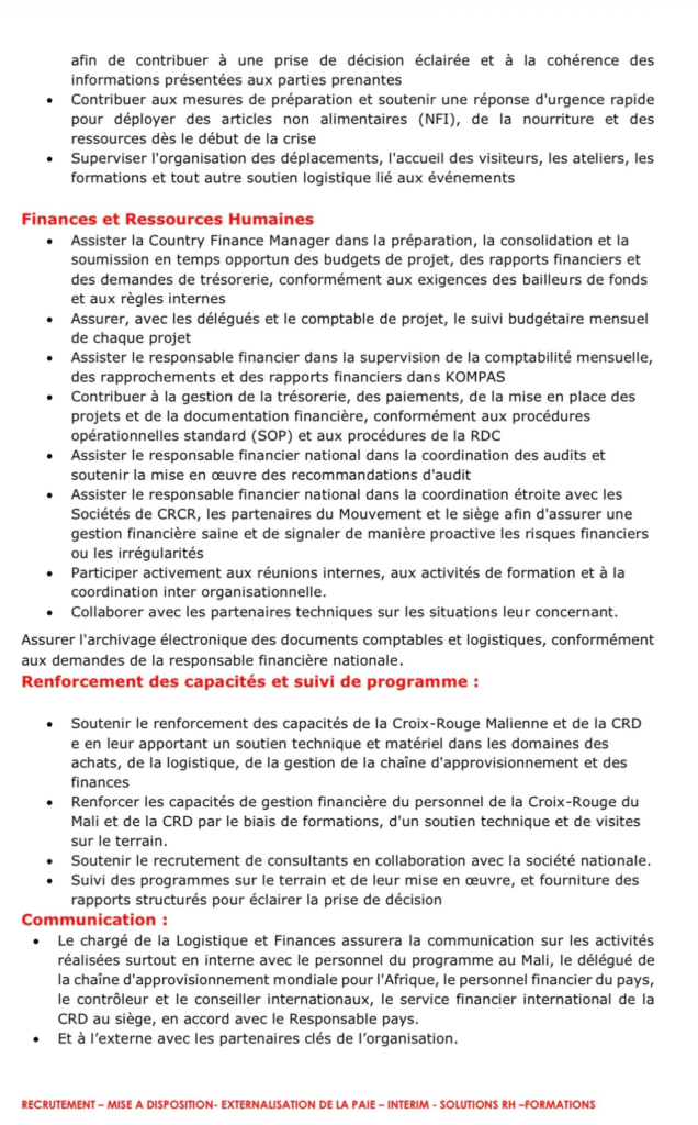Sous la direction du Délégué Pays, le chargé de la logistique et des finances sera