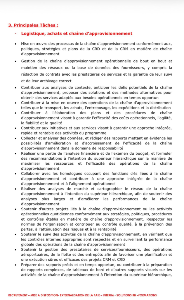 - Mise en œuvre des processus de la chaîne d’approvisionnement conformément aux, politiques, stratégies et plans de la CRD et de la CRM en matière de chaîne d’approvisionnement