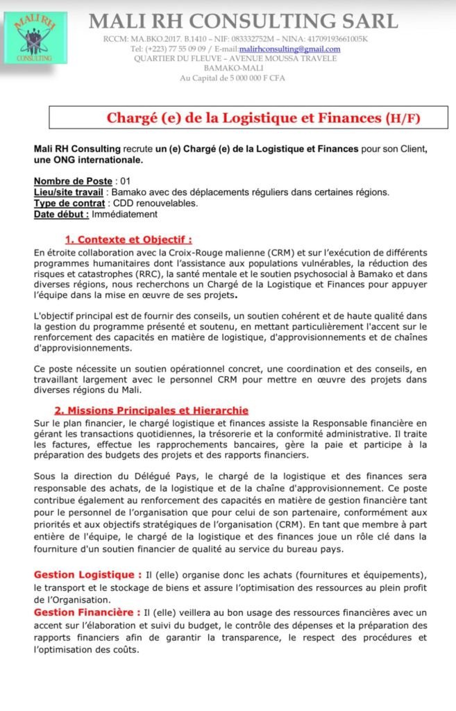 Mali RH Consulting recrute un (e) Chargé (e) de la Logistique et Finances pour son Client,