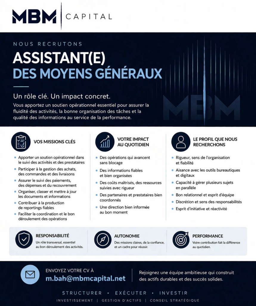 📩 Les candidats intéressés peuvent adresser leur CV à : m.bah@mbmcapital.net