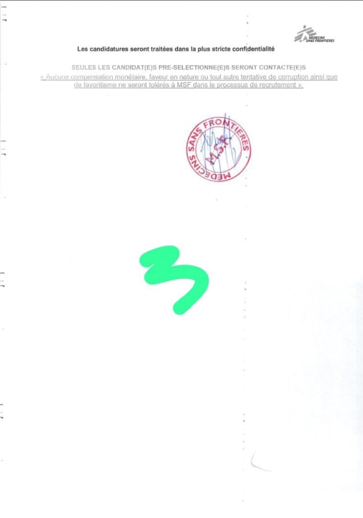 Aucune compensation monétaire, faveur en nature ou tout autre tentative de corruption ainsi que de favoritisme ne seront tolérés à MSF dans le processus de recrutement.