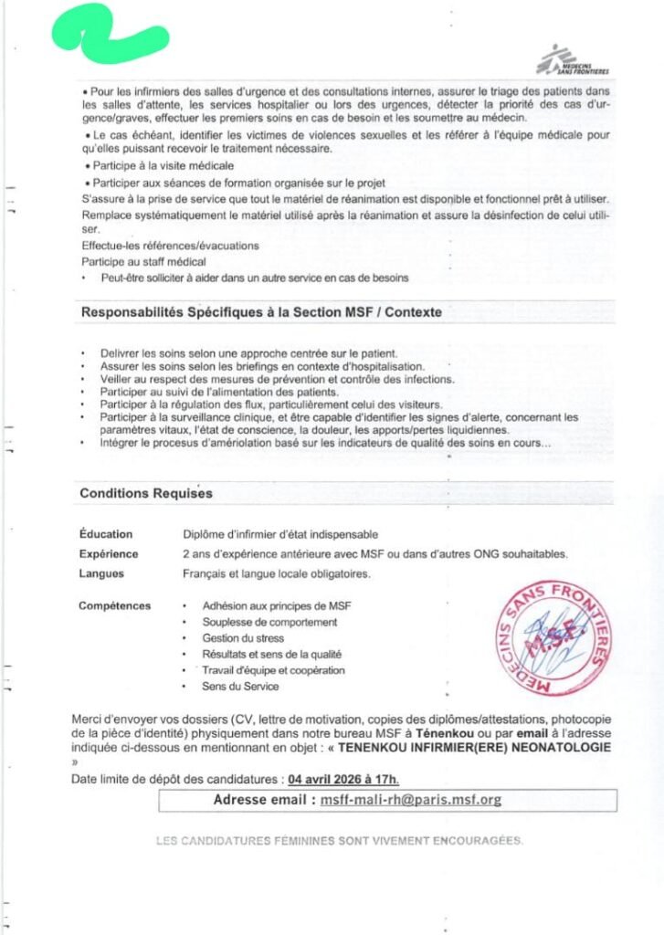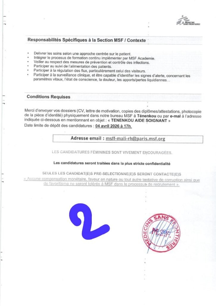 Adresse email: msff-mali-rh@paris.msf.org