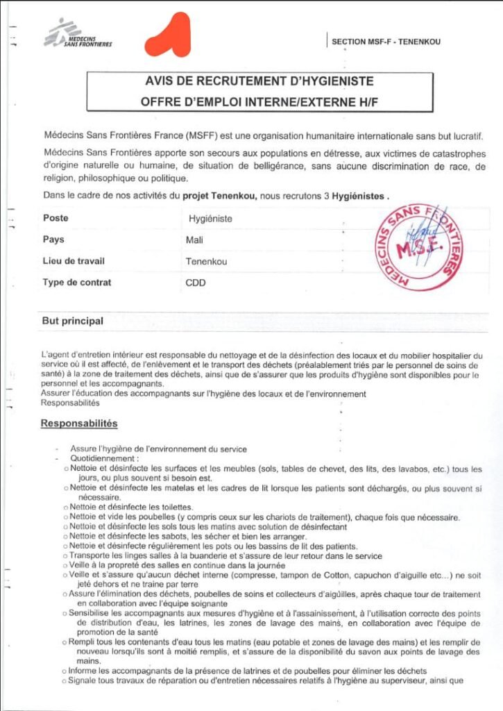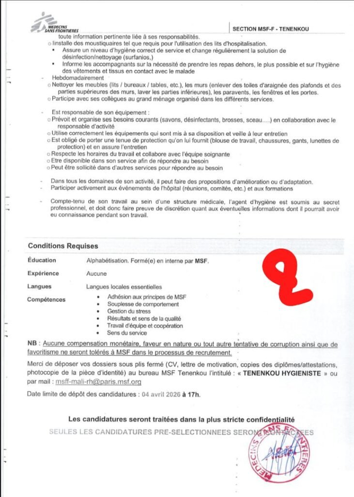 photocopie de la pièce d’identité) au bureau MSF Tenenkou l’intitulé: << TENENKOU HYGIENISTE >> ou