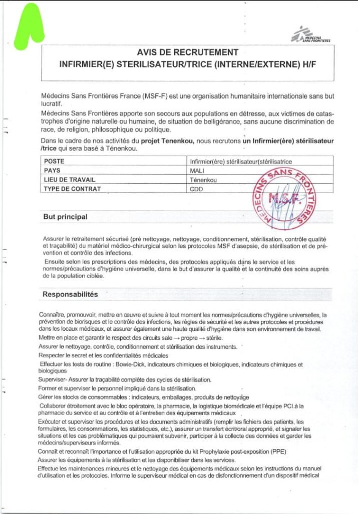 Merci d’envoyer vos dossiers (CV, lettre de motivation, copies des diplômes/attestations, photocopie de la pièce d’identité) physiquement dans notre bureau MSF à Ténenkou ou par email à l’adresse indiquée ci-dessous en mentionnant en objet : « TENENKOU INFIRMIER STERILISATEUR »