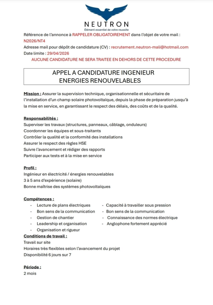 Adresse mail pour dépôt de candidature (CV) : recrutement.neutron-mali@hotmail.com