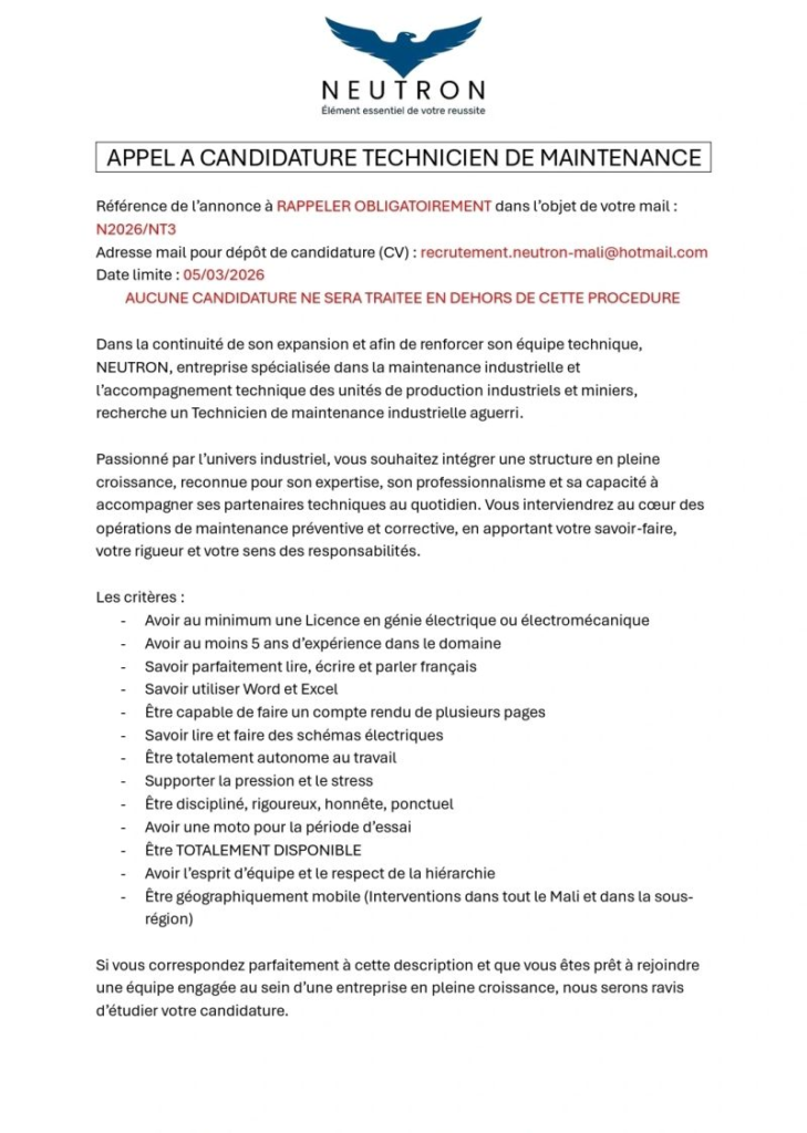 Adresse de candidature :Â recrutement.neutron-mali@hotmail.com