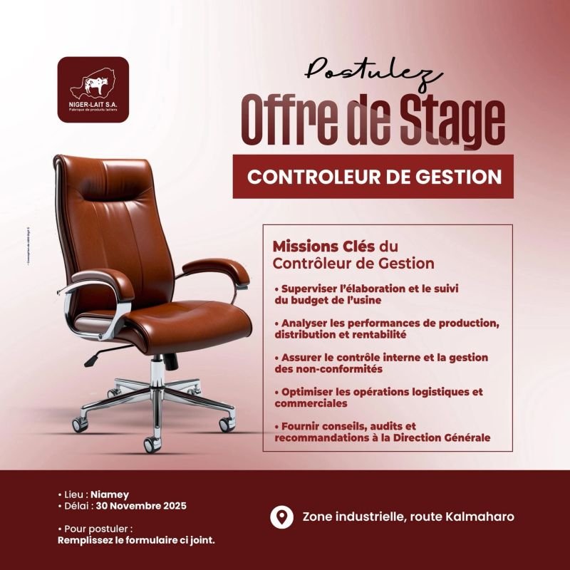 Dans le cadre du renforcement de son équipe, Niger Lait S.A., leader national dans la transformation et la distribution de produits laitiers, lance un appel à candidatures pour le poste de Contrôleur de Gestion.