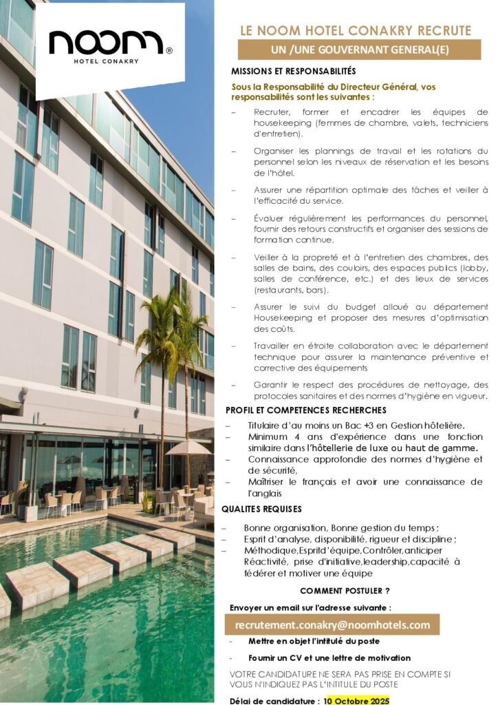 NOOM HOTELS CONAKRY RECRUTE GOUVERNANT GENERAL H/F