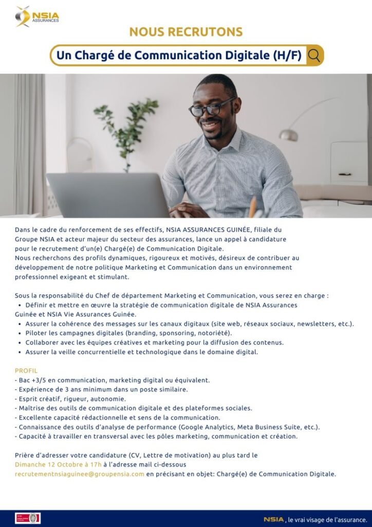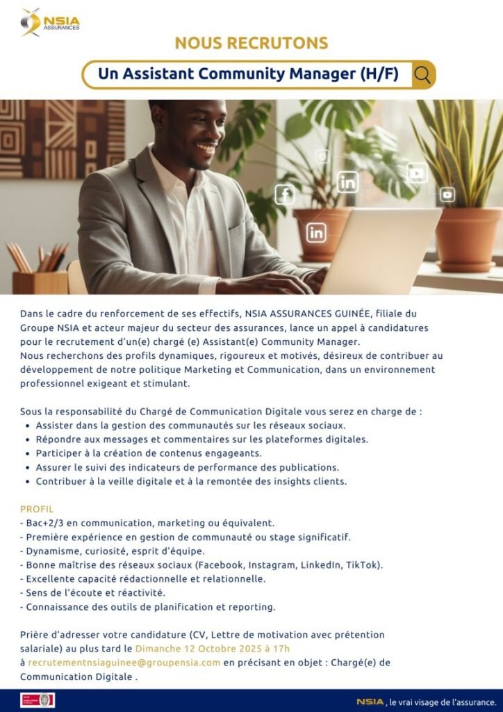 Candidatures (CV + Lettre de motivation) à envoyer avant le 12 octobre 2025 à 17h à : recrutementnsiaguinee@groupe-nsia.com