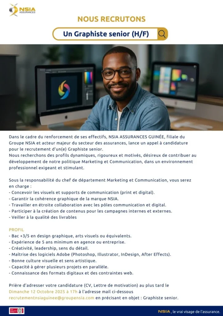 NSIA Assurances Guinée recrute un(e) Graphiste Senior pour concevoir et sublimer nos supports de communication print & digital.