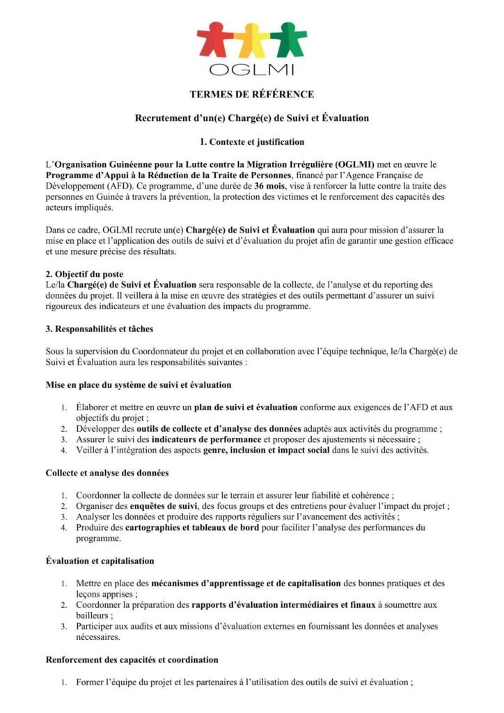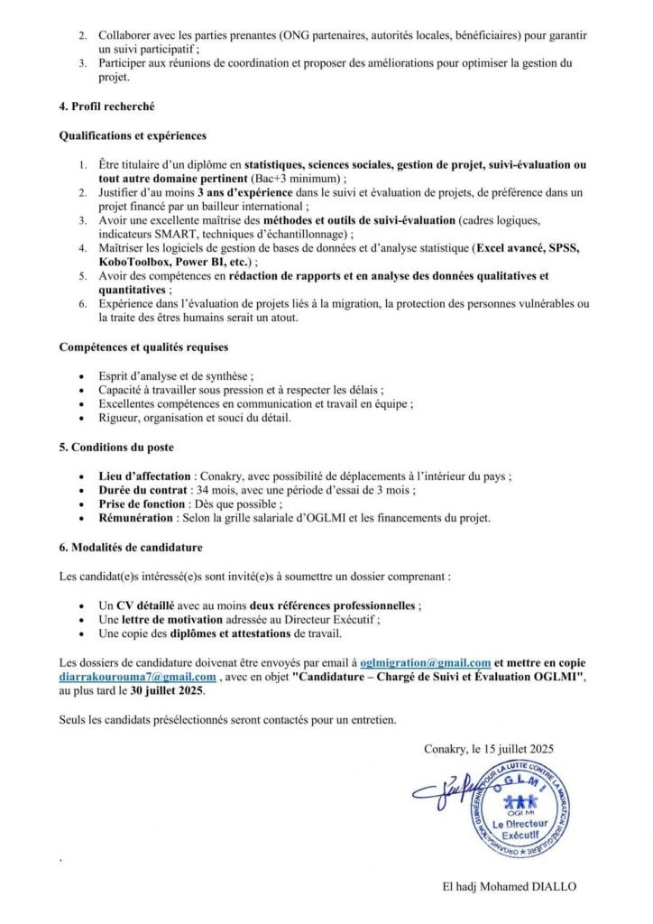 diarrakourouma7@gmail.com, avec en objet « Candidature – ChargĂ© de Suivi et Évaluation OGLMI« ,