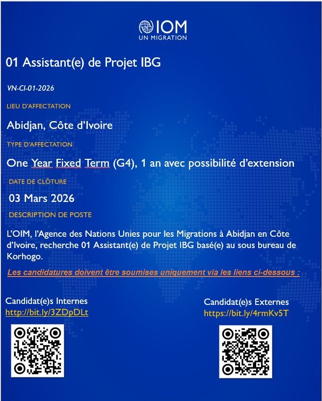Dans le cadre de la mise en oeuvre de ses activités l’Organisation Internationale pour les Migrations (OIM) en Côte d’Ivoire recherche un(e) Assistant(e) de projets.