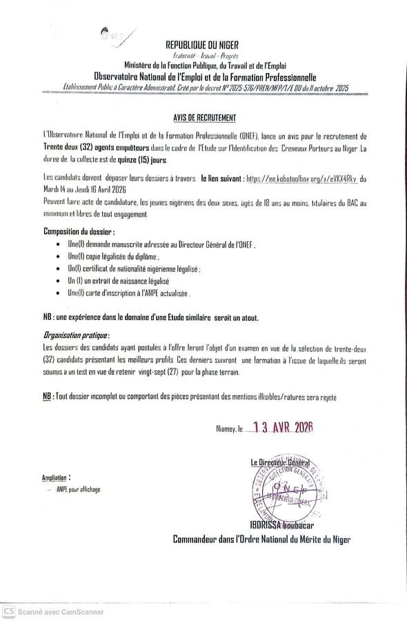 L’Observatoire National de l’Emploi et de la Formation Professionnelle (ONEF), lance un avis pour le recrutement de Trente deux (32) agents enquĂŞteurs dans le cadre de l’Etude sur l’identification des Creneaux Porteurs au Niger La durĂ©e de la collecte est de quinze (15) jours