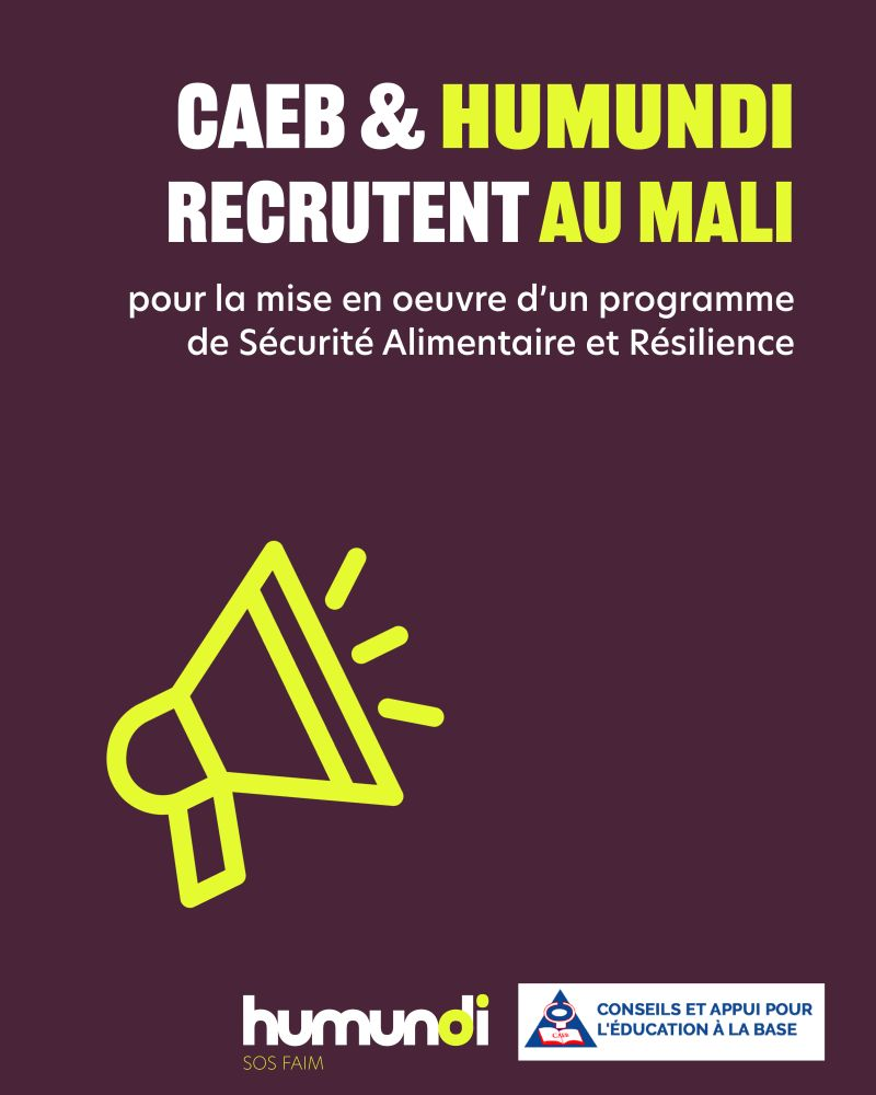 Dans le cadre de la mise en œuvre d’un Programme de sécurité Alimentaire et Résilience au Mali, le consortium Humundi-CAEB recherche des ressources humaines qualifiées pour différents postes.