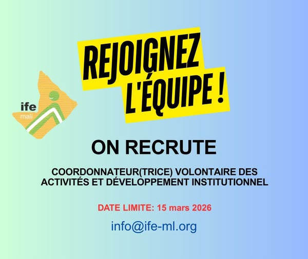 L’ONG IFE Mali recrute un(e) Agent(e) Volontaire pour appuyer la mise en œuvre de ses activités administratives, opérationnelles et de mobilisation de ressources. 𝐋𝐞 (𝐥𝐚) 𝐜𝐚𝐧𝐝𝐢𝐝𝐚𝐭 (𝐞) 𝐝𝐨𝐢𝐭 𝐚𝐯𝐨𝐢𝐫 𝐮𝐧𝐞 𝐞𝐱𝐩é𝐫𝐢𝐞𝐧𝐜𝐞 𝐚𝐯é𝐫é𝐞 𝐝𝐚𝐧𝐬 𝐥𝐞 𝐦𝐢𝐥𝐢𝐞𝐮 𝐝𝐞𝐬 𝐎𝐍𝐆 𝐞𝐭 𝐚𝐬𝐬𝐨𝐜𝐢𝐚𝐭𝐢𝐨𝐧𝐬 𝐚𝐮 𝐌𝐚𝐥𝐢.