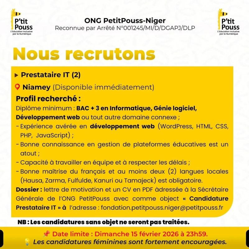 ONG PETITPOUSS-NIGER RECRUTE 02 PRESTATAIRES IT H/F