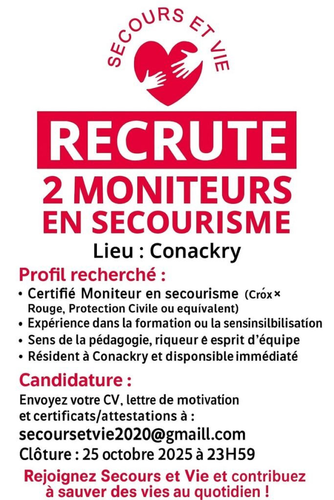 L’organisation Secours et Vie (SeVie) recherche actuellement deux (2) Moniteurs en Secourisme dynamiques et passionnés pour renforcer son équipe à Conakry.