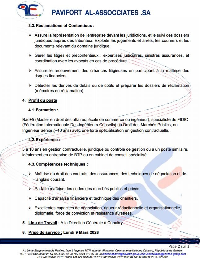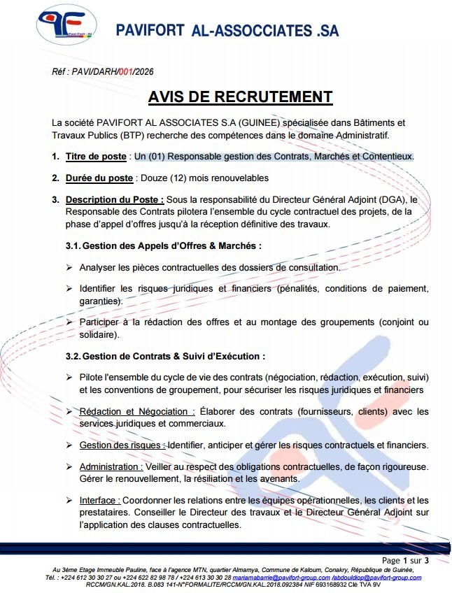 La société PAVIFORT AL ASSOCIATES S.A (GUINEE) spécialisée dans Bâtiments et Travaux Publics (BTP) recherche des compétences dans le domaine Administratif.