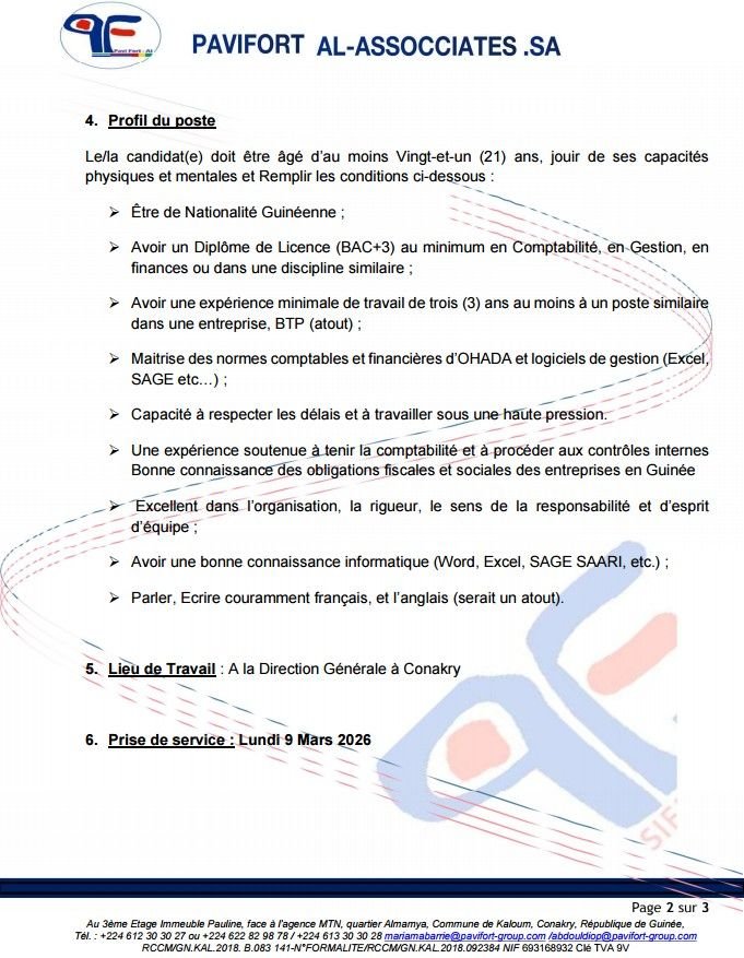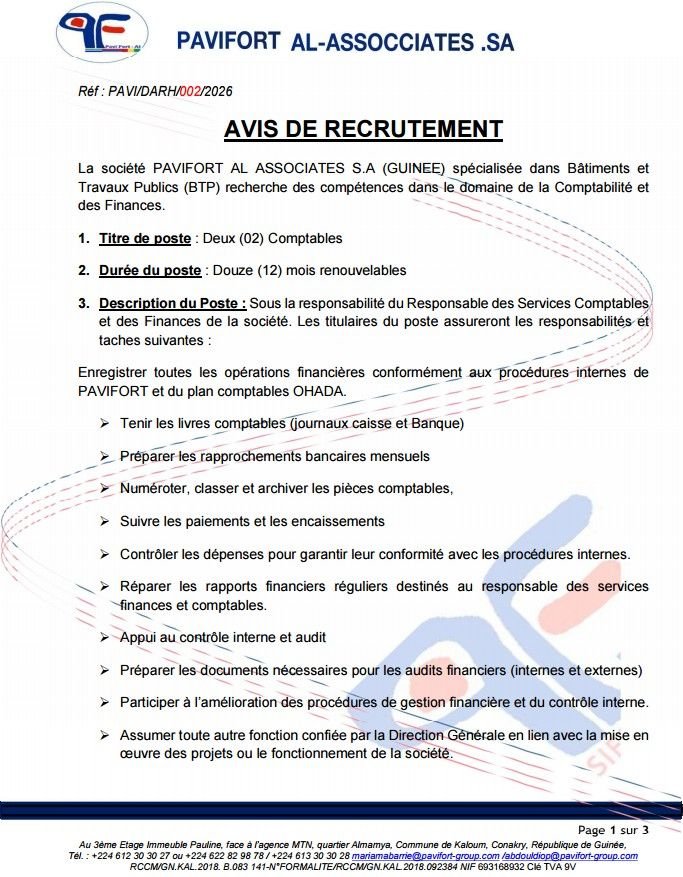 La société PAVIFORT AL ASSOCIATES S.A (GUINEE) spécialisée dans Bâtiments et Travaux Publics (BTP) recherche des compétences dans le domaine de la Comptabilité et des Finances.