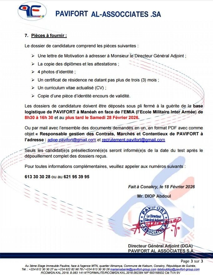 Tél.: +224 612 30 30 27 ou +224 622 82 98 78/+224 613 30 30 28 mariamabarie@pavifort-group.com/abdouldiop@pavifort-group.com