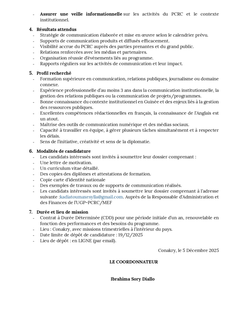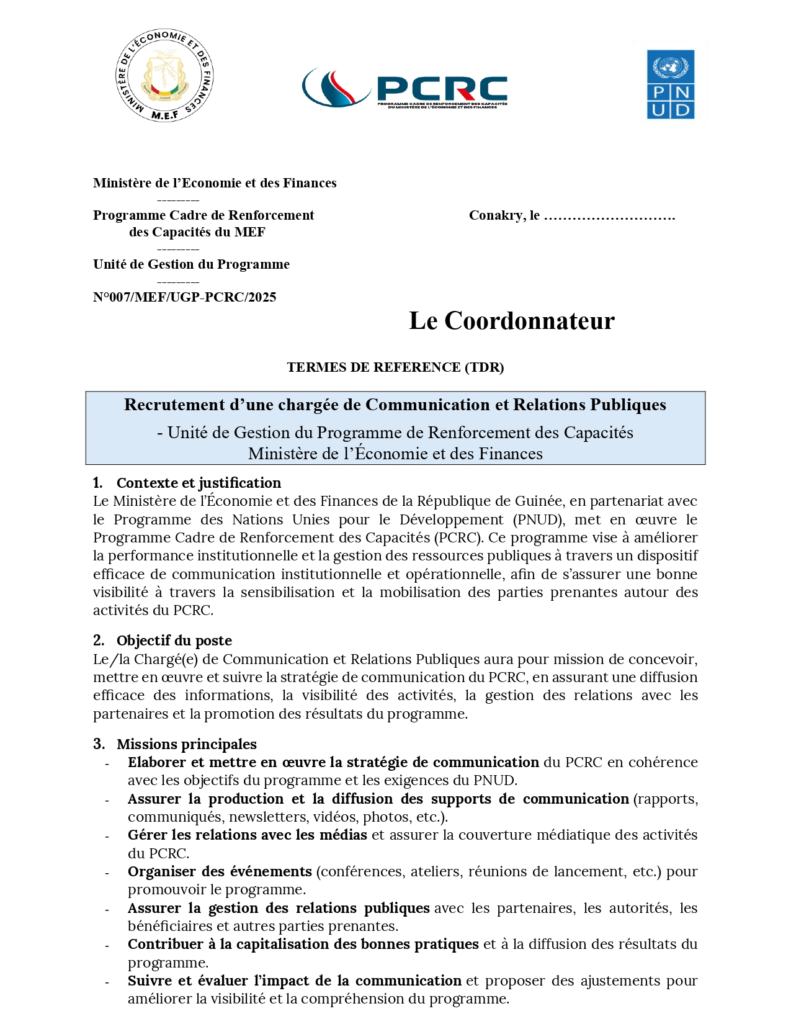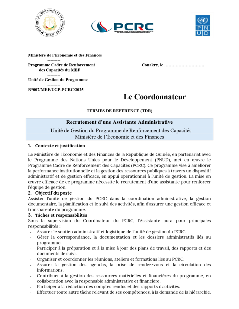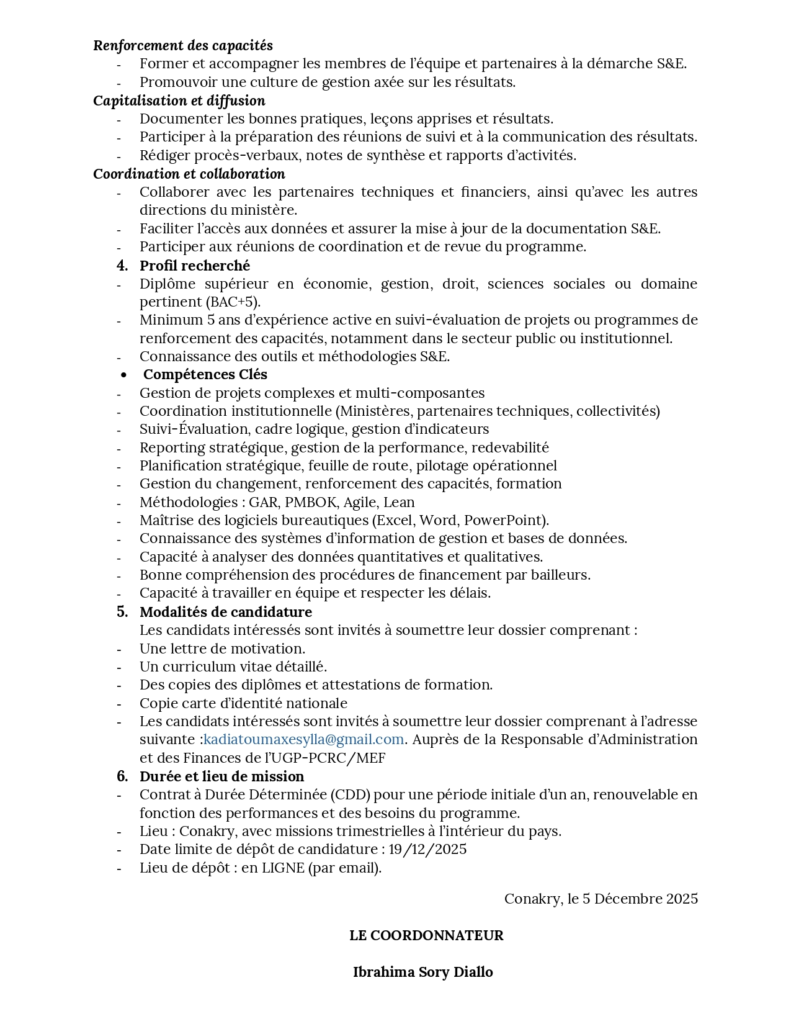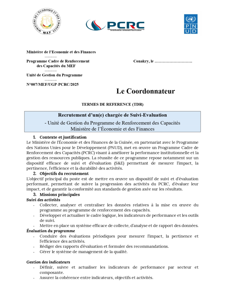 fonction des performances et des besoins du programme. - Lieu: Conakry, avec missions trimestrielles Ă l’intĂ©rieur du pays.